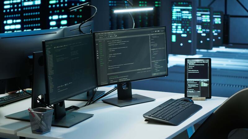 Engineer in data center sitting down at desk, installing software on computer, troubleshooting issues. Woman arriving at work in server hub, establishing performance benchmarks, camera A Pro Video