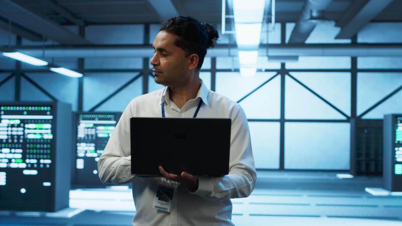 Technician using laptop in data center, managing servers, operating systems. Professional in server hub using notebook to ensure networks are secure and functioning properly, camera A Pro Video