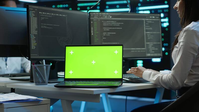 Data center engineer responsible for installation of networking equipment solving tasks on isolated screen laptop. Woman doing maintenance on server room infrastructure using mockup notebook, camera A Pro Video