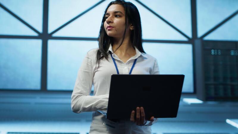 Admin in data center managing servers, operating systems and software programs. Tracking shot of woman in server hub ensuring networks are secure, up to date, and functioning properly, camera A Pro Video