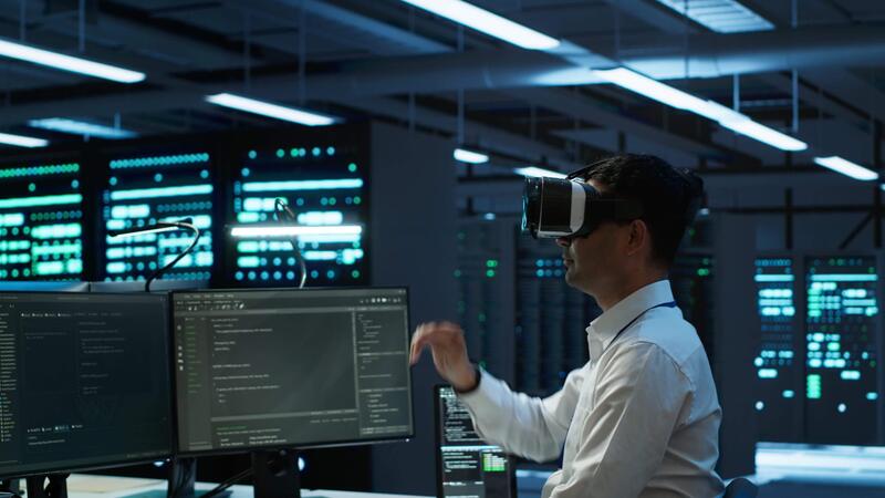Admin in data center using virtual reality tech to ensure system can handle networking tasks. Server room worker wearing VR headset to track network traffic with PC, making improvements, camera A Pro Video