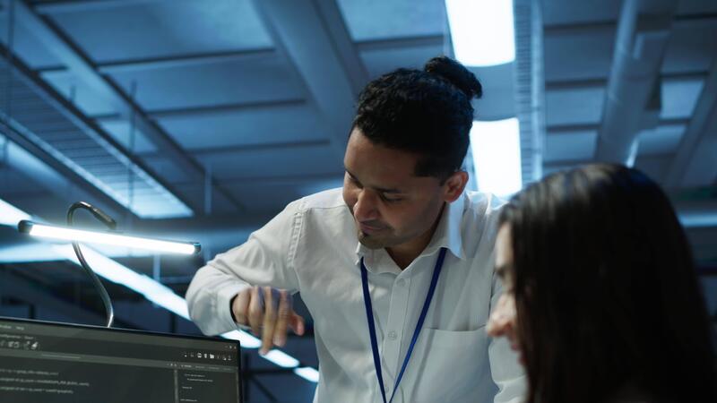 Teamworking colleagues in high tech data center managing and maintaining databases, ensuring data integrity, security and availability. Team of specialists updating server room systems, camera A Pro Video