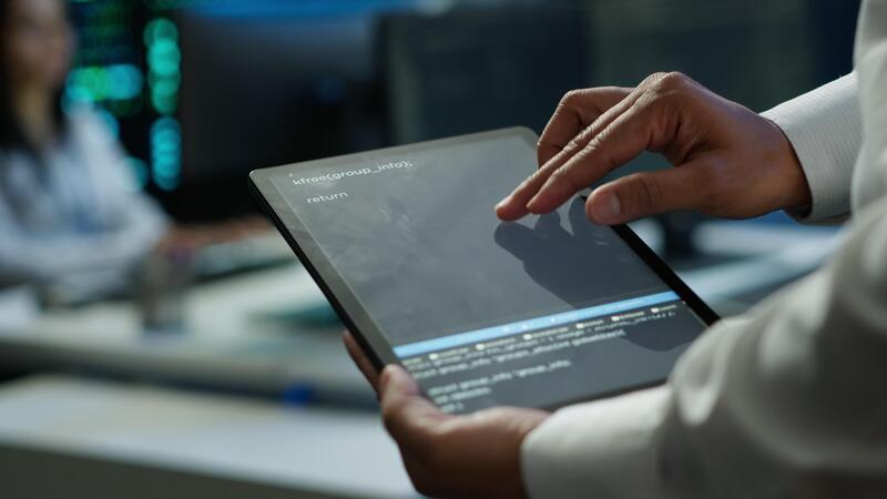 Data center admin responsible for installation of networking systems solving tasks in workspace. Close up of tablet used by IT worker doing maintenance on server farm gear, camera A Pro Video