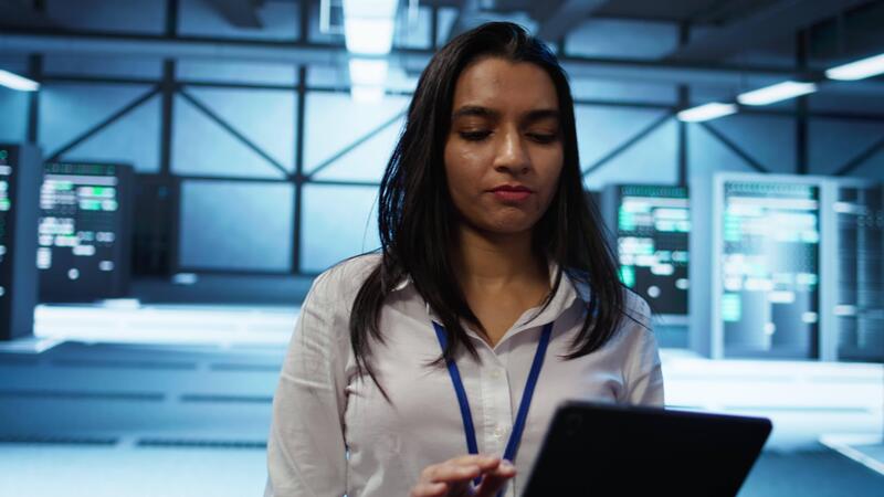 Engineer in high tech data center managing and maintaining databases, ensuring data integrity, security and availability. Indian woman updating server room supercomputers systems, camera B Pro Video