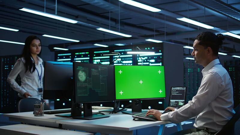 Engineer in server hub using green screen PC to stop hacker passing company firewall and stealing sensitive user data. Worker looking at mockup computer, seeing security breach notification, camera B Pro Video