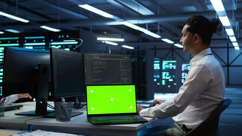 Data center engineer responsible for installation of networking equipment solving tasks on isolated screen laptop. Man doing maintenance on server room infrastructure using mockup notebook, camera B Pro Video