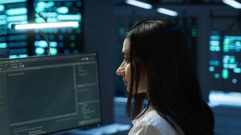 Portrait of cheerful engineer in data center installing software on computer, troubleshooting issues. Smiling IT specialist in server room establishing performance benchmarks Pro Video