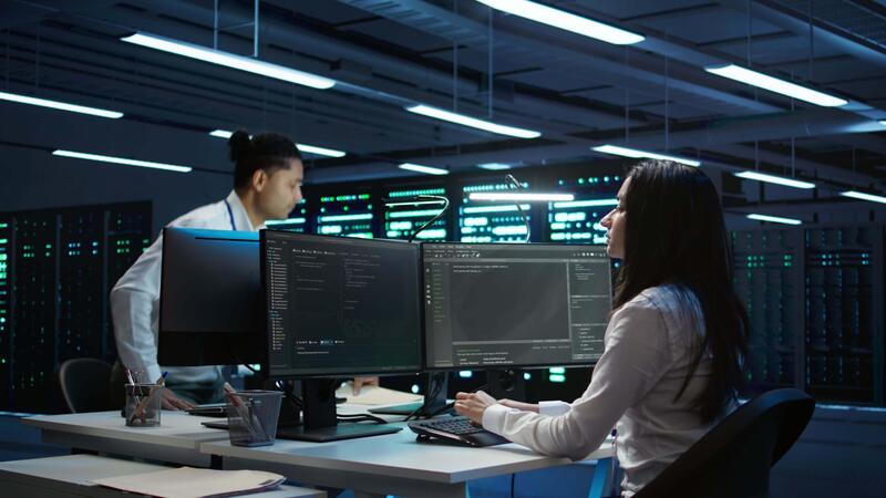 Team of researchers in data center monitoring security threats using PC, implementing cybersecurity measures. Teamworking colleagues ensuring compliance with regulations, camera B Pro Video