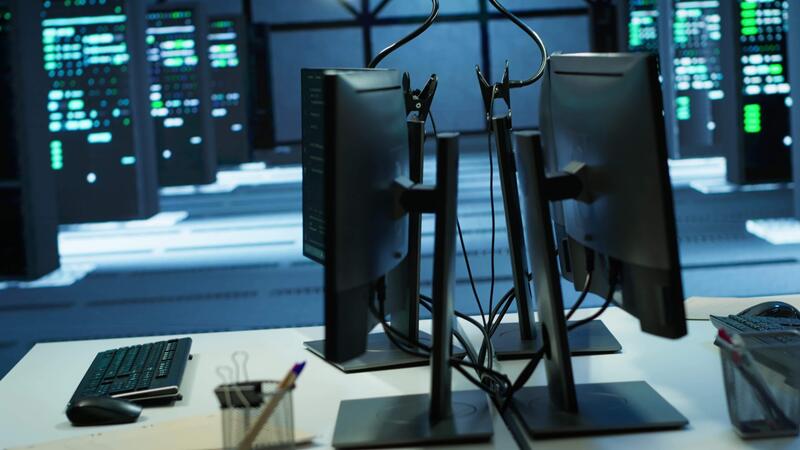 Computers in server farm used to ensure optimal performance and reliability, managing supercomputers. High tech data center used for overseeing network connections, handheld camera shot Pro Video