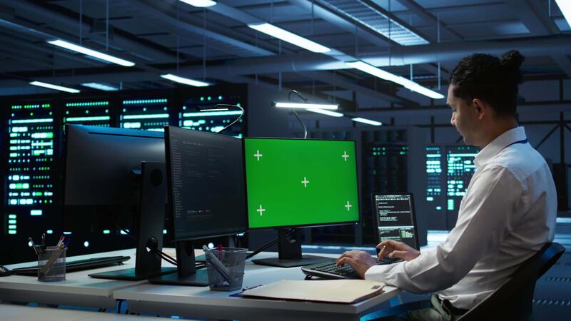 Engineer working with chroma key PC in data center used for managing gear energy consumption. Employee using isolated screen monitor in workspace used for automation in server farm, camera B Pro Video