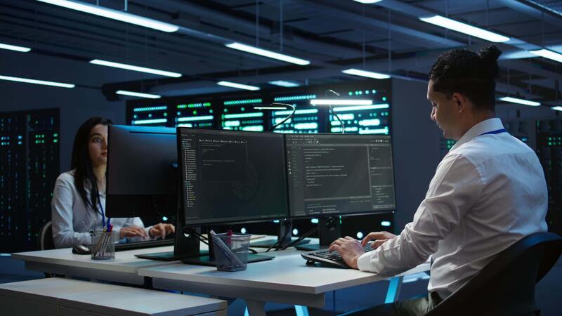 Engineers in high tech data center establishment installing software on computer, troubleshooting issues. Team of IT specialists in server room establishing performance benchmarks Pro Video