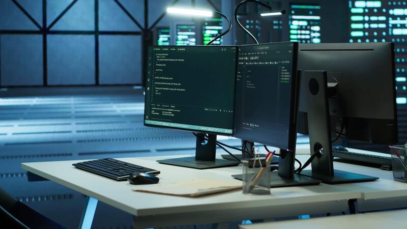 Computers in data center used for monitoring security attacks threatening supercomputers rows. PCs used by futuristic server hub workplace admins to protect equipment, handheld camera shot Pro Video