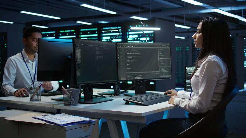 Team of technicians in data center designing, implementing and managing infrastructure to ensure optimal performance and reliability. Teamworking colleagues in server room coding on computer, camera B Pro Video