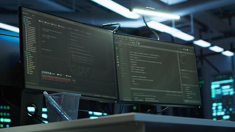 Computers in data center facility used for managing hardware mainframe energy consumption. Close up on PC displays in high tech establishment used for automation and monitoring processes in server hub Pro Video