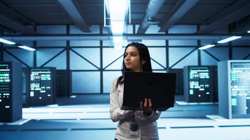 System administrator in data center monitoring security threats, implementing cybersecurity measures. Woman ensuring compliance with regulations to protect data center gear, camera B Pro Video