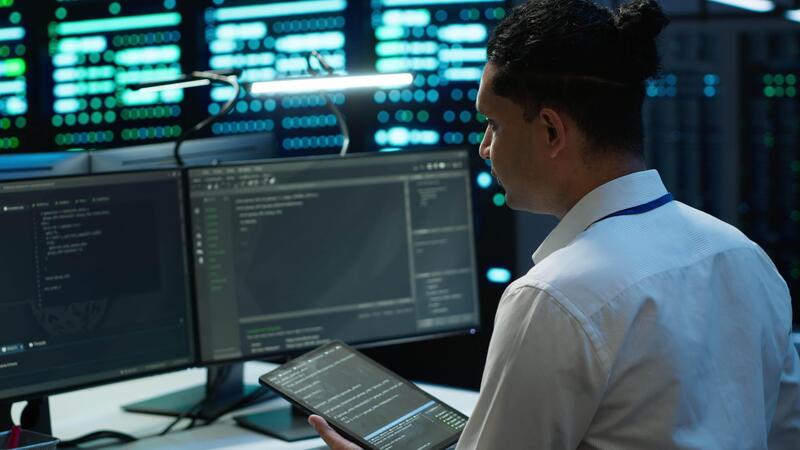 System administrator in data center installing software on computer, troubleshooting issues using tablet. IT staff member in server hub establishing performance benchmarks, camera A Pro Video