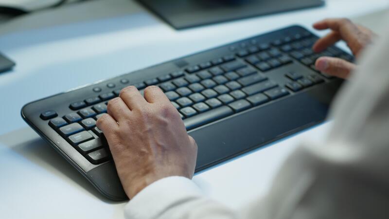Admin in data center designing, implementing and managing gear to ensure optimal performance and reliability. Close up of expert typing on keyboard in server room, coding on computer, camera A Pro Video