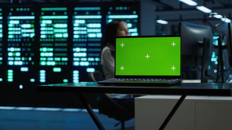 Focus on mockup laptop used by technician in data center in blurry background managing servers. Close up of chroma key notebook used by expert in server hub to ensure networks are secure, camera A Pro Video