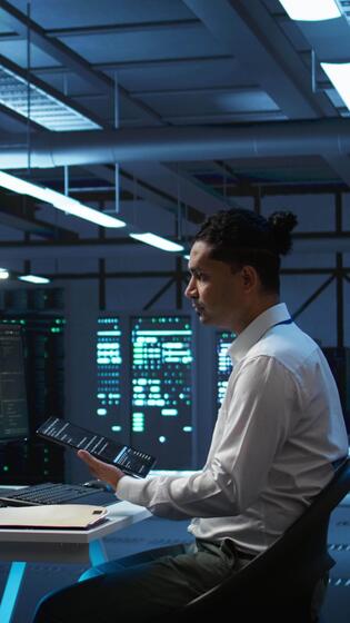 Vertical System administrator in data center installing software on computer, troubleshooting issues using tablet. IT staff member in server hub establishing performance benchmarks, camera B Pro Video