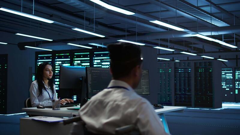 Person with disability in inclusive high tech server room facility ensuring data remains shielded from threats. Wheelchair user protecting data center hardware equipment, camera B Pro Video