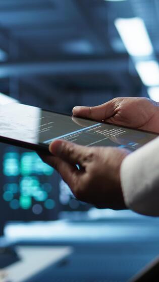 Vertical Data center admin responsible for installation of networking systems solving tasks in workspace. Close up of tablet used by IT worker doing maintenance on server farm gear, camera B Pro Video