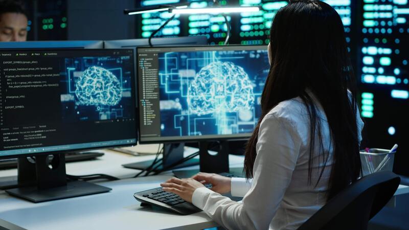 Technicians coworkers using AI tech on computer to do checkup in server room. Teamworking colleagues in data center using artificial intelligence technology to process datasets for training, camera A Pro Video