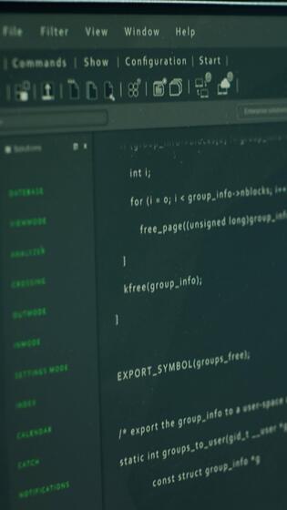 Vertical Close up of lines of code running on computer display in modern data center, monitoring security threats. PC software open on monitor used by server hub employees ensuring compliance with regulations Pro Video