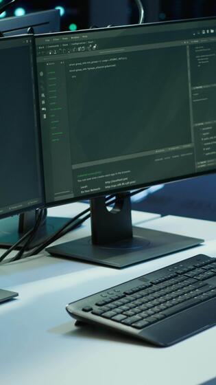 Vertical Data center workplace with networking systems installed used for managing infrastructure racks. Computer screens on desk in advanced server hub used for overseeing equipment Pro Video