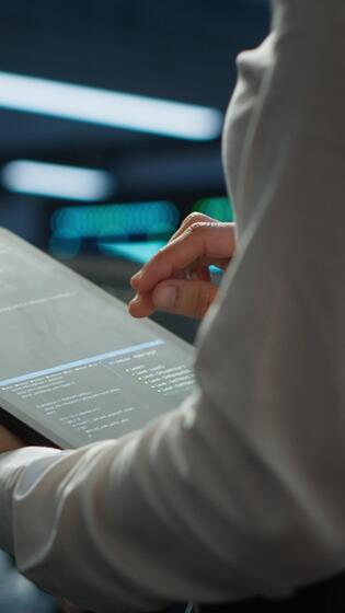 Vertical Engineer working in data center used for managing infrastructure rigs energy consumption. Employee using tablet in workplace used for automation and monitoring processes in server farm, camera A Pro Video