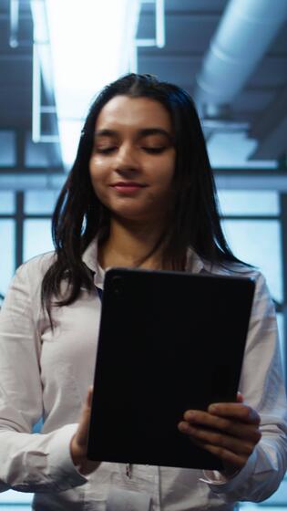 Vertical Admin in data center monitoring security threats with tablet, implementing cybersecurity measures. Specialist using device, ensuring compliance with regulations to protect data center gear, camera B Pro Video
