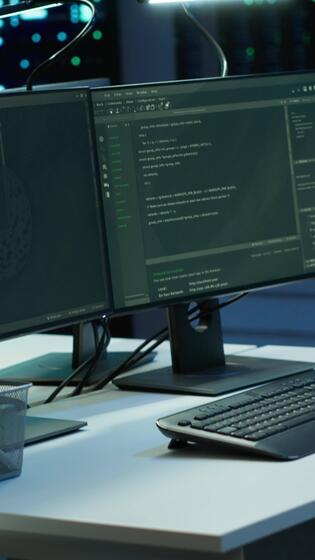 Vertical Data center workspace with networking systems installed used for managing supercomputers. Computer displays on desk in high tech server farm used for overseeing equipment Pro Video