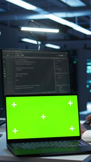 Vertical Admin in data center using isolated screen laptop to design, implement and manage gear, ensuring optimal performance and reliability. Expert in server room coding on chroma key notebook, camera B Pro Video