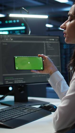 Vertical Zoom in on green screen mobile phone used by data center employee troubleshooting issues. Engineer uses mockup smartphone device in server hub, establishing performance benchmarks, camera B Pro Video