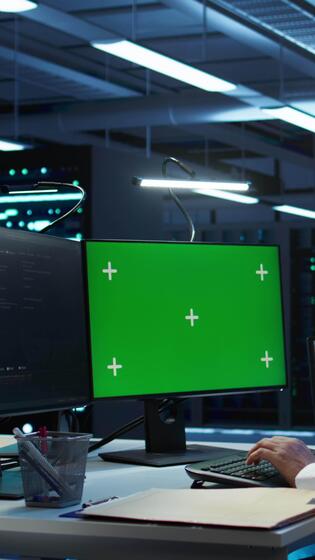 Vertical Engineer working with chroma key PC in data center used for managing gear energy consumption. Employee using isolated screen monitor in workspace used for automation in server farm, camera B Pro Video
