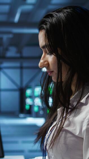 Vertical IT specialist in data center providing technical support to customers, troubleshooting issues. Server farm worker carrying out operational technical interventions requested by clients, camera B Pro Video