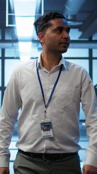 Vertical Admin walking amidst server rows, looking to ensure optimal performance and reliability by implement and managing gear. IT staff member in data center overseeing high tech facility, camera B Pro Video