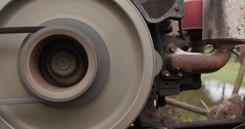 Close up, Belt rotation on the tractor engine. Spin around while the machine is running. Free Video
