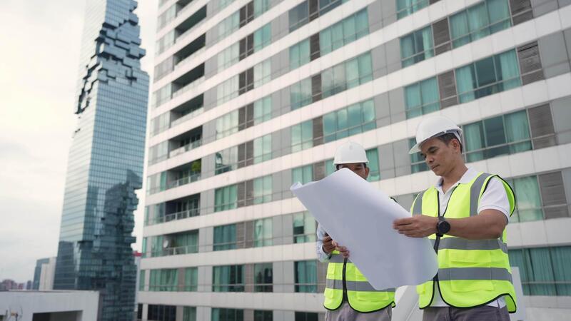 Engineer men are standing on a rooftop, looking at blueprints. They are wearing safety vests and hard hats. The building they are standing in front of is a large, modern skyscraper Free Video