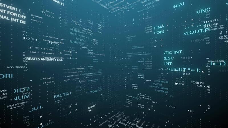 The camera moves in parts of the source code and information particles in 3d space Pro Video