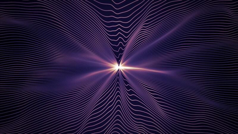 Looped abstract background with smooth wavy strings and bright shiny light in a center. Flowing purple and yellow glow pattern for science, technology and art performance. Seamless vj loop , 4K 60 fps Pro Video
