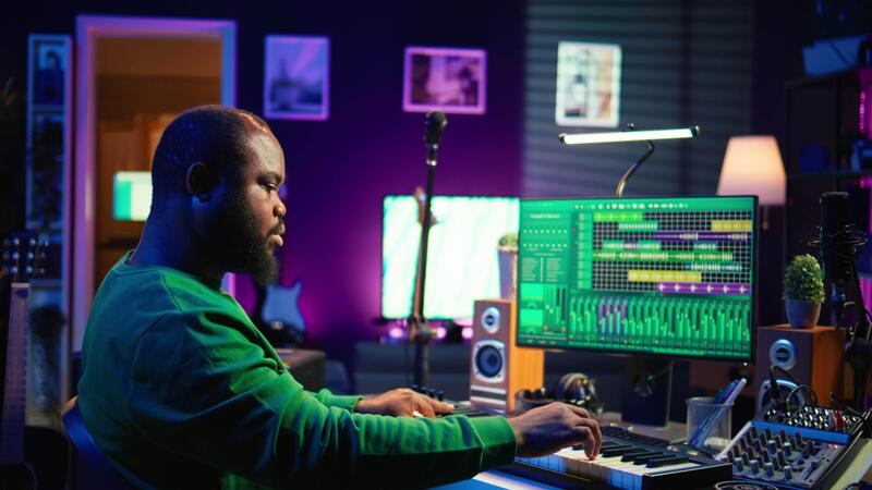 Skilled music producer creating new songs on midi controller synthesizer, working with mixing console and professional software on pc. Artist using piano and mastering acoustical tunes. Camera B. Pro Video