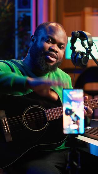 Vertical Professional composer teaching guitar lessons online on master class, recording himself playing acoustic instrument accords and explaining notes for tutorial. Young musician making vlogs. Camera A. Pro Video