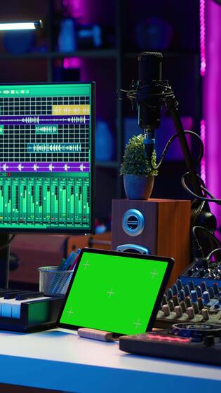 Vertical Artist producer creating new music with mix and master techniques, using a screen with copy space layout. Skilled audio engineer editing tracks in post production, digital audio software. Camera A. Pro Video