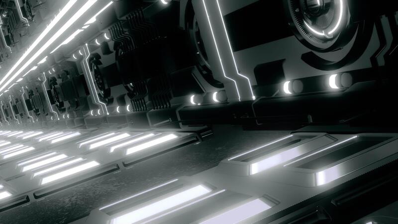 Technological tunnel with neon lines and pipes. Motion. Futuristic 3D space with glowing lines and technologies. Spaceship Tunnel with neon lines. Cyberpunk Pro Video