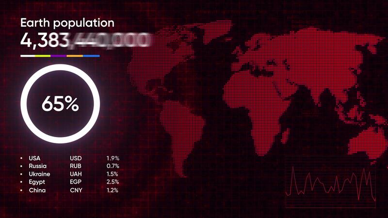 3D animation of earth's population. Motion. Vivid graph with moving lines and changing numbers on world map. Graph with world map and increasing number of inhabitants of planet earth Pro Video
