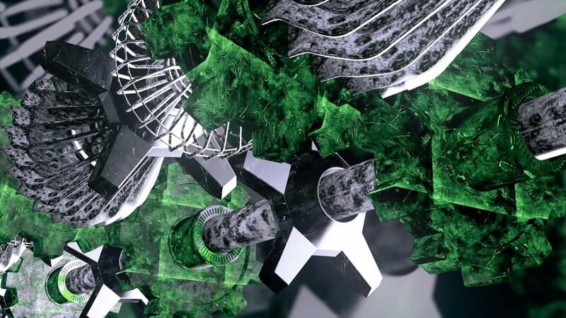 Green background. Motion.Various iron objects of the mechanism in the animation move in different directions very quickly . Pro Video