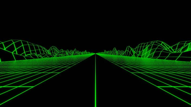 Retro futuristic synthwave grid background with hills on a black endless space. Design. Fast drive with a road and grid. Pro Video