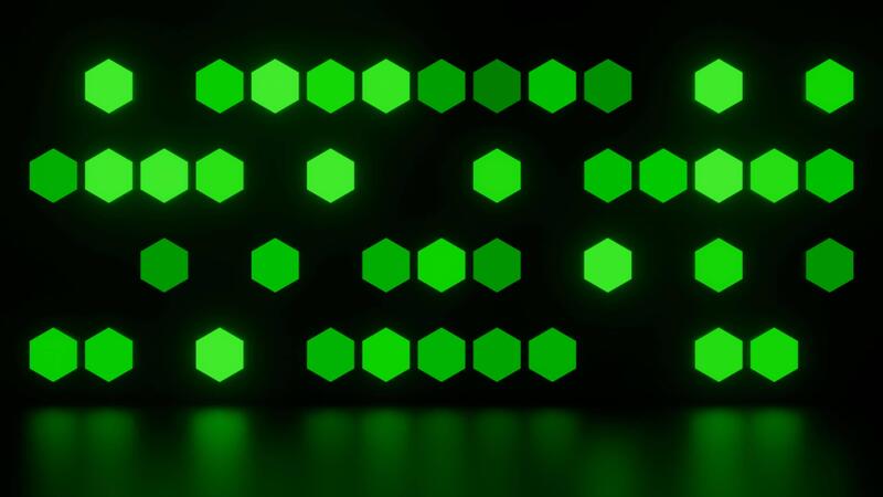 Background of flashing hexagons. Design. Glowing hexagons with reflection on surface of black background. Geometric background with glowing hexagons Pro Video