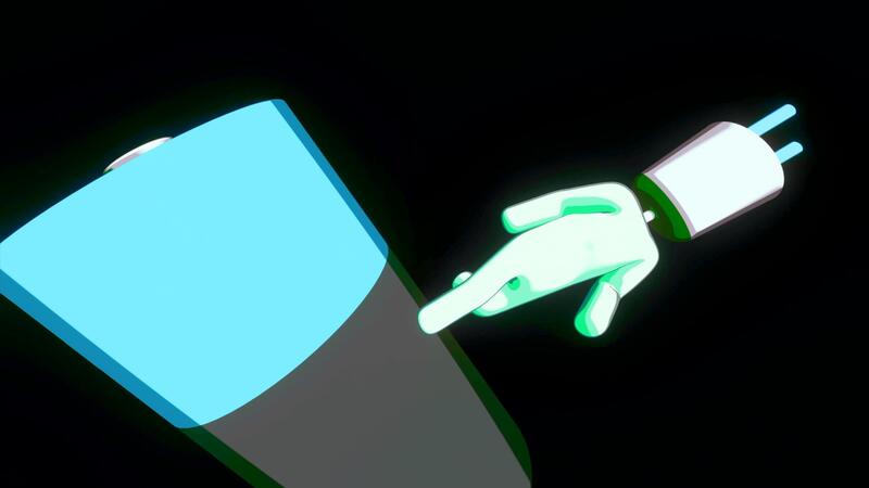 Black background. Design.A bright green robot in animation walking around a small object with a picture of a cross. Pro Video