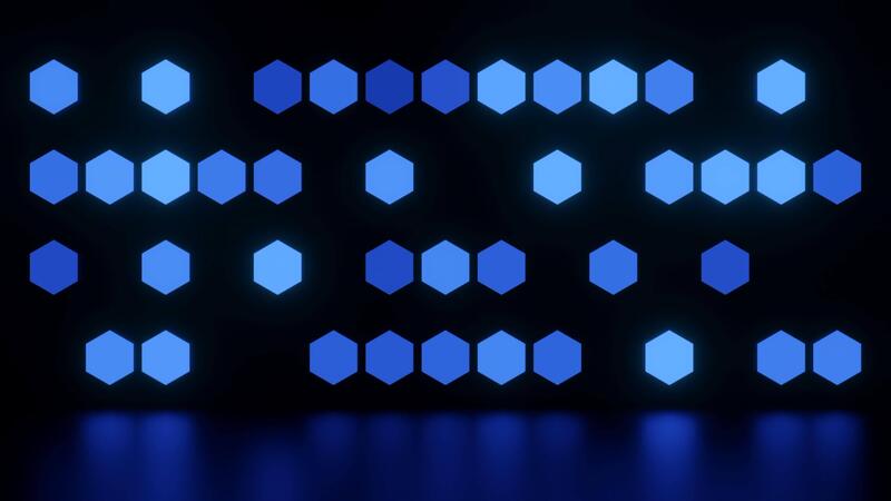 Background of flashing hexagons. Design. Glowing hexagons with reflection on surface of black background. Geometric background with glowing hexagons Pro Video